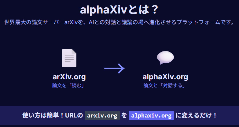 使い方は驚くほど簡単です。読みたいarXiv論文のURLにある「arxiv.org」の部分を「alphaxiv.org」に書き換えるだけで、その論文のディスカッションページにアクセスできます 。これにより、ユーザーは既存のarXivの資産を最大限に活用しながら、新たな価値を享受できるのです。
