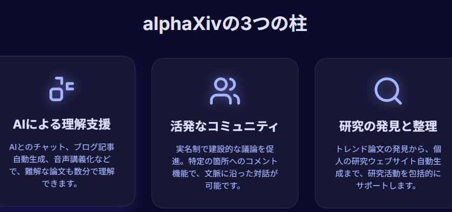 alphaXivは、論文の読解から議論、情報発信までをシームレスに支援する多彩な機能を備えています。その中核をなすのは、「AIによる理解支援」「活発なコミュニティ」「研究の発見と整理」の3つの柱です。