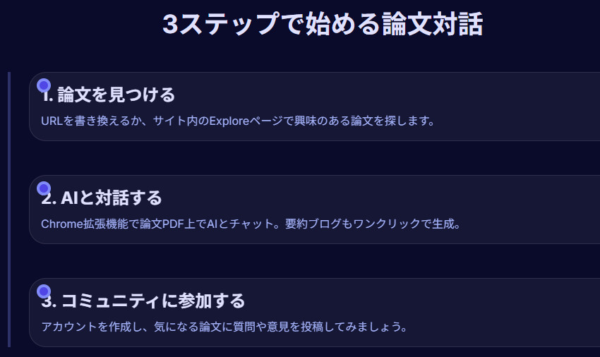 alphaXivを始めるのは非常に簡単です。以下の3つのステップで、あなたも今日から最先端の研究対話に参加できます。