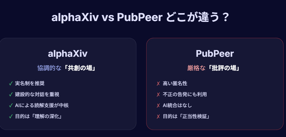 arXiv論文にコメントを付けるプラットフォームとしては、以前から「PubPeer」が存在します。しかし、alphaXivはPubPeerとは全く異なる目的と文化を持つプラットフォームです。その違いを理解することで、alphaXivの独自性がより明確になります。