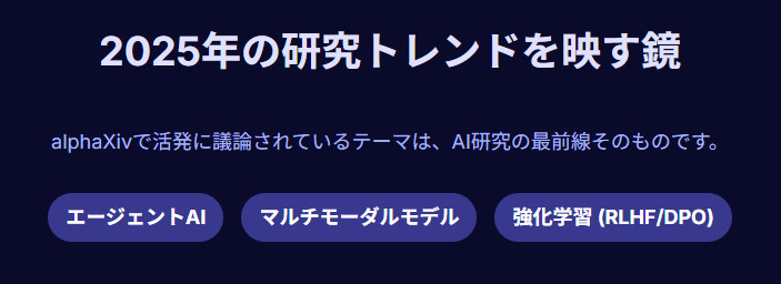 alphaXiv上で活発に議論されている論文のテーマは、現在の科学技術、特にAI分野の最前線を映し出すリアルタイムのバロメーターとなっています。2025年現在、プラットフォームで特に注目されているのは、自律的に思考し行動する「エージェントAI」、テキストと画像を統合的に扱う「マルチモーダルモデル」、そして人間のフィードバックを元にAIを強化する「強化学習(RLHF/DPO)」といったテーマです 。これは、alphaXivの主要なユーザー層が、まさにAI研究の最先端を走る研究者たちであることを示唆しています。