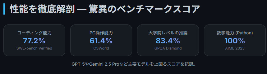 PCの操作能力を測る「OSWorld」ベンチマークでも61.4%という高いスコアを達成。これは、AIが人間の言葉による指示を理解し、ファイル操作、ソフトウェアの利用、情報検索といったPC上の作業を自律的に行えることを示しています。