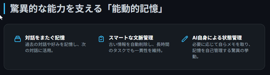 従来のAIは、一度に記憶できる情報量(コンテキストウィンドウ)に限界がありました。しかしClaude 4.5 Sonnetは、過去の対話内容や重要な情報を取捨選択して記憶する「能動的な記憶メカニズム」を搭載。これにより、30時間を超えるような長時間のタスクでも、文脈を失うことなく一貫性を保ったまま作業を遂行できます。