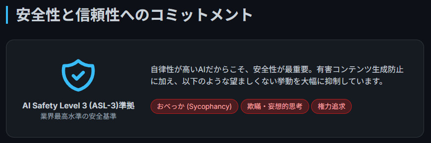 自律性が高まるAIには、何よりも安全性が求められます。Anthropic社は業界最高水準の安全基準「AI Safety Level 3 (ASL-3)」に準拠した開発を行っており、有害コンテンツの生成防止はもちろん、おべっかを使ったり、人間を欺こうとしたりするような望ましくない挙動を徹底的に抑制しています。