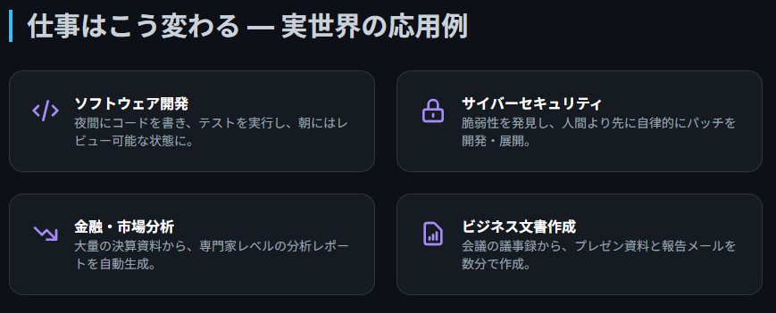 特にその圧倒的なコーディング能力と長時間タスクの遂行能力は、開発者や研究者、ビジネスの現場に革命的な変化をもたらすでしょう。