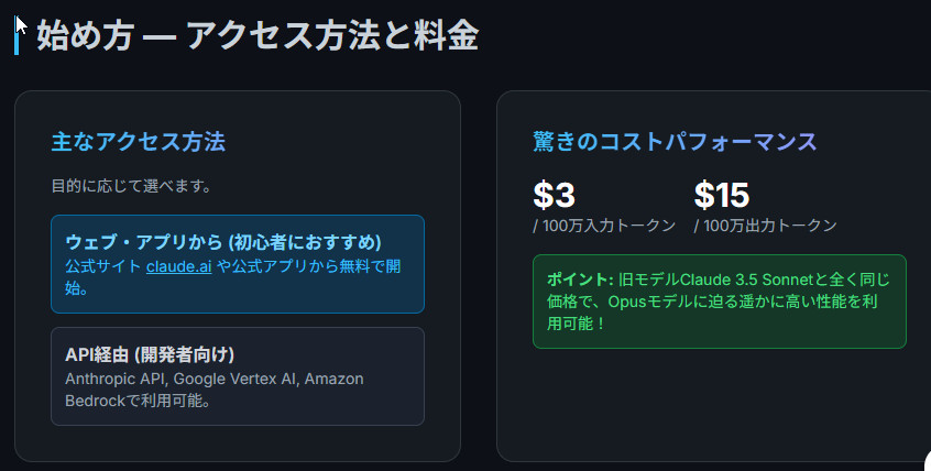驚くべきことに、これだけの性能向上を実現しながら、APIの利用料金は旧モデルのClaude 3.5 Sonnetから据え置かれています。(入力15/100万トークン)。これまで最上位モデル(Opus)でしか実現できなかったタスクを、約5分の1のコストで実行できるため、AI活用のコストパフォーマンスが劇的に向上します。