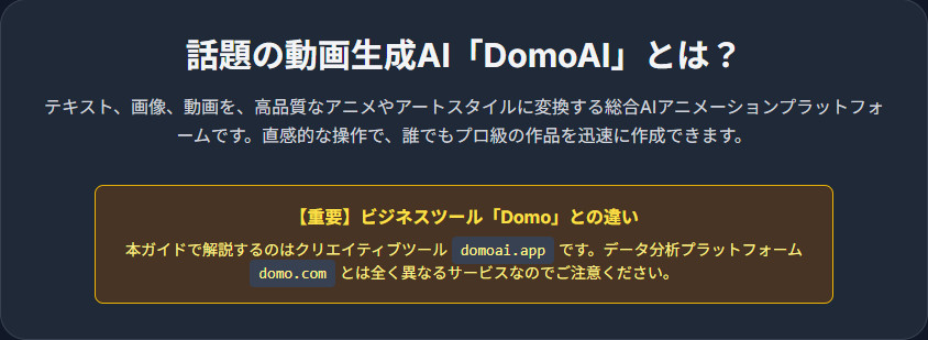 DomoAIは、テキスト、画像、既存のビデオを、アニメ風や芸術的なスタイルなど、多様なビジュアルコンテンツに変換するために設計された総合的なAIアニメーションプラットフォームです 。300万人を超えるアクティブユーザーと活発なコミュニティがその人気を物語っており 、初心者でも直感的に扱える手軽さと、プロ品質のアニメーションを迅速に生成できる能力が、多くのクリエイターから支持されています 。