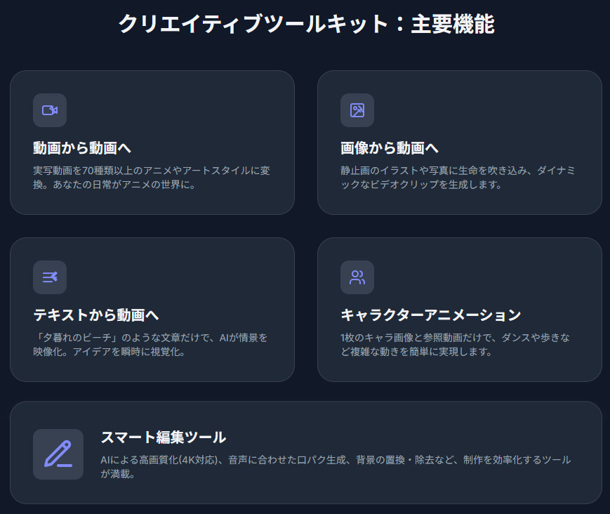 - AI Video Upscaler: 生成した動画や既存の動画の解像度を、AIの力でHDや4Kといった高品質に向上させます 。