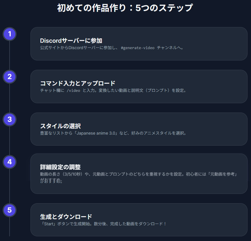 - Step 5: 生成とダウンロード すべての設定が完了したら、「Start」ボタンを押して生成を開始します。数分待つと、AIが生成したアニメ風動画がチャンネルに投稿されます。結果を確認し、気に入ったものをダウンロードして保存しましょう 。