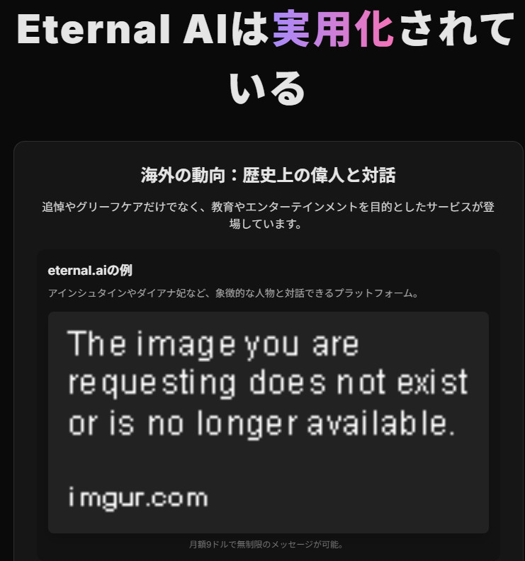 その一つである「Eternal AI」(eternal.ai)は、プリンセス・ダイアナ、スティーブ・ジョブズ、アインシュタインといった象徴的な人物をAIとして「復活」させ、ユーザーが対話できるプラットフォームを提供しています。このサービスは、追悼やグリーフケアというよりも、教育やエンターテインメント、そして過去の偉人からのインスピレーションを得ることを目的としています 。