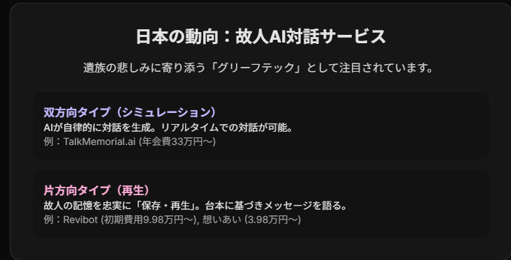 - 故人を再現するAIの倫理的問題、(https://www.jstage.jst.go.jp/article/pjsai/JSAI2025/0/JSAI2025_4Q3OS2304/_article/-char/ja)