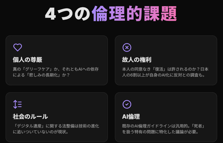 しかし、ある調査では、日本人の6割以上が自身の死後にAIとして復活することに反対しているという結果も出ています。もし本人が望まないのであれば、たとえ遺族のためであっても、その人格をデジタル空間に再創造することは、故人の尊厳を侵害する行為ではないでしょうか。この「デジタルな復活を拒否する権利」をどう保障するのかは、喫緊の課題です。現状では、法的なルールが存在しないため、サービス提供事業者が独自に倫理ガイドラインを設けて対応しているのが実情です 。