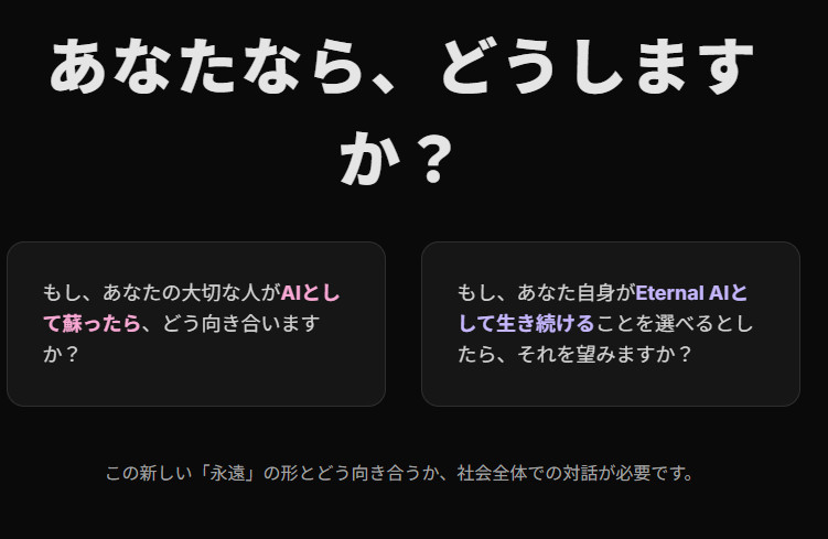 そして、もしあなた自身がEternal AIとして生き続けることを選べるとしたら、あなたはそれを望みますか?