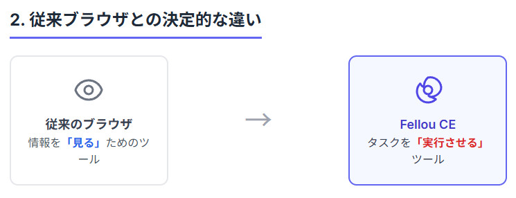 従来のブラウザ(ChromeやSafariなど)は、あくまで情報を「表示・検索」するためのツールでした。ユーザー自身がすべての操作を行うことが前提です。一方、Fellou CEはタスクを「実行」させるためのツールです 。