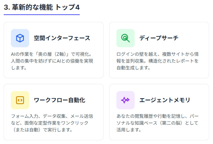 Fellou CEは、単に作業を自動化するだけでなく、その体験自体を新しい次元へと引き上げる画期的な機能を備えています。ここでは、特に象徴的な4つの機能を紹介します。