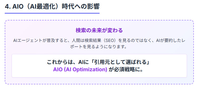 Fellou CEのようなエージェント型AIブラウザの登場は、単なる新しい便利ツールの出現以上の意味を持ちます。これは、ウェブコンテンツの作り手にとって「AIO(AI Optimization)」が不可欠となる時代の到来を告げています。