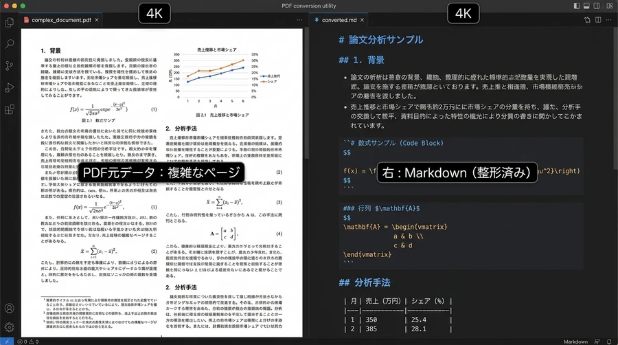 PDFから単に文字を取り出すだけでなく、その「構造」を維持することは、現代のAI(大規模言語モデル)活用において極めて重要です。Fire-PDFは、抽出したデータをAIが最も理解しやすい「Markdown形式」で出力することに特化しています 。