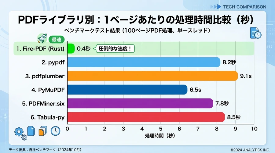 PDF処理において、ツール選択の基準となるのは「速度」「精度」「機能性」のバランスです。FirecrawlのFire-PDF(Rustエンジン)と、Pythonで広く普及しているライブラリを比較することで、その立ち位置を明確にします。