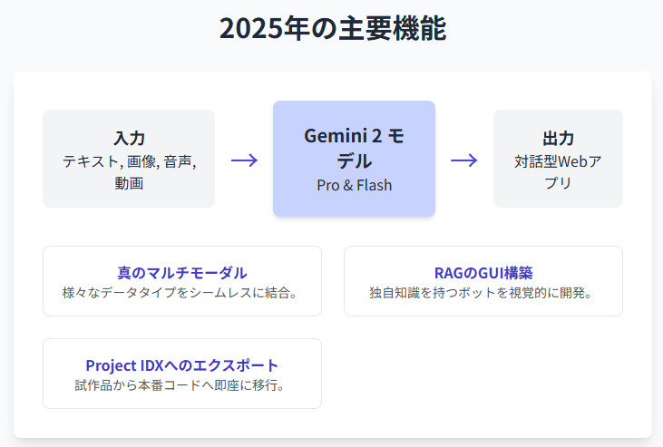 - Firebase Studio / Vertex AI連携: プロトタイプから本格的な本番アプリケーションへとシームレスにスケールさせるための開発パス 。