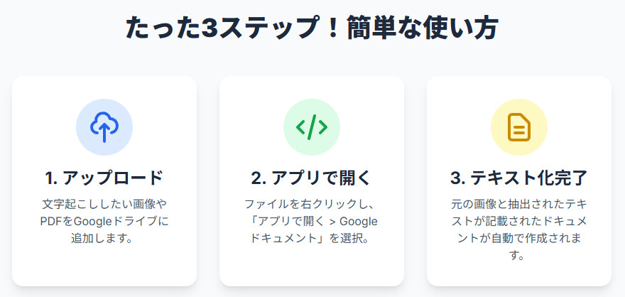 GoogleドライブのOCR機能の使い方は非常にシンプルで、誰でもすぐに実践できます。ここでは、具体的な手順を3つのステップに分けて解説します。
