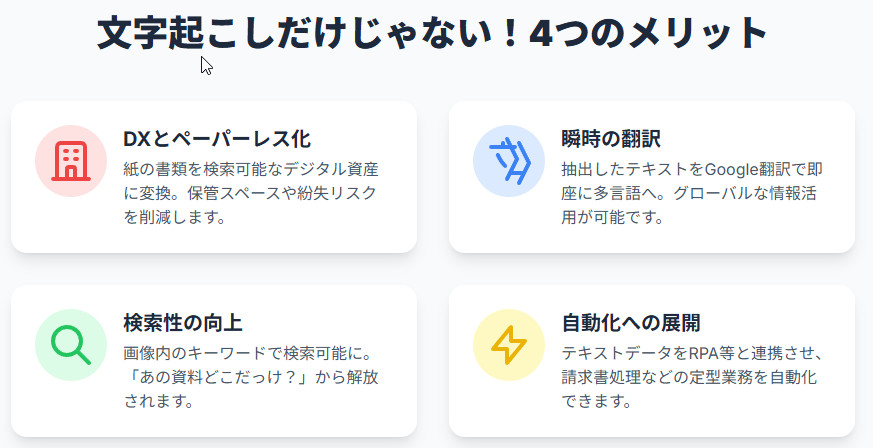 GoogleドライブのOCR機能の価値は、単に文字を入力する手間を省くだけにとどまりません。抽出されたテキストデータは、さらなる価値を生み出す「起点」となります。ここでは、OCRがもたらす4つの主要なメリットと、具体的な活用シーンを紹介します。