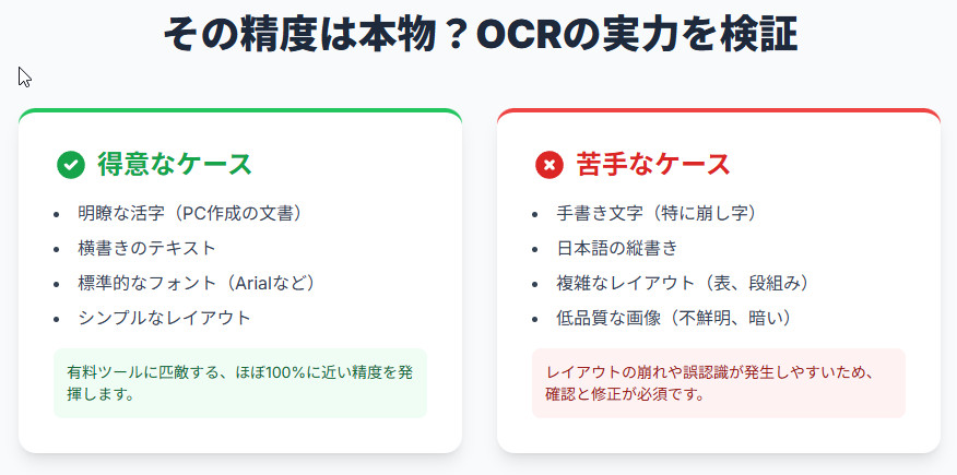 OCRが最も得意とするのは、パソコンで作成され、印刷されたような「明瞭な活字の横書きテキスト」です。ArialやTimes New Romanのような標準的なフォントが使われている場合、その認識精度は驚異的で、多くの検証で98%からほぼ100%に近い精度が報告されています 。これは、有料の専門ツールに匹敵するレベルであり、この条件下では非常に信頼性の高いツールと言えます。