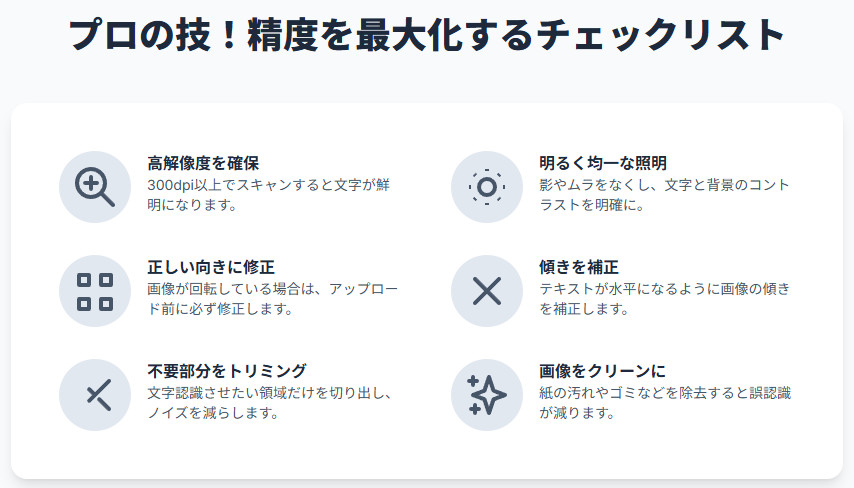 OCRの精度は、読み込ませる画像の品質に大きく左右されます。「Garbage In, Garbage Out(質の悪い入力からは、質の悪い出力しか得られない)」という原則は、OCRにも当てはまります。ここでは、認識精度を最大限に高めるための具体的なチェックリストを紹介します。ユーザーが一手間加えることで、AIのパフォーマンスを大きく向上させることが可能です。