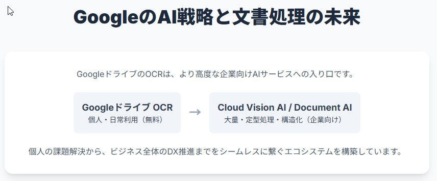 Googleドライブに搭載されている無料のOCR機能は、実はGoogleが展開する壮大なAIエコシステムへの入り口です。個人の日常的な課題を解決するこのツールは、より高度で専門的なGoogleのAIサービスへと繋がっています。