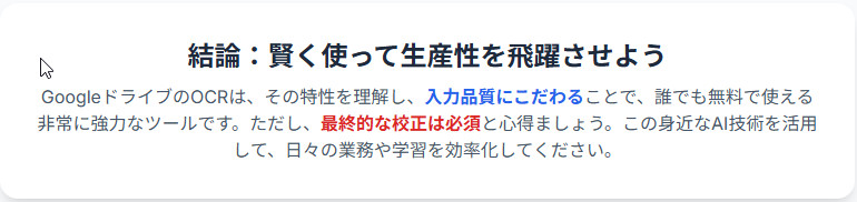 本記事では、GoogleドライブのOCR機能について、その基本から応用、精度、そして未来までを包括的に解説しました。最後に、このツールを効果的に活用するための重要なポイントをまとめます。
