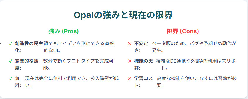 Opalはまだ実験段階のツールですが、アーリーアダプターからは多くのフィードバックが寄せられています。ここでは、その評価を「強み(熱狂的な歓迎の声)」と「限界(慎重な意見)」の両面から、バランス良く見ていきましょう。