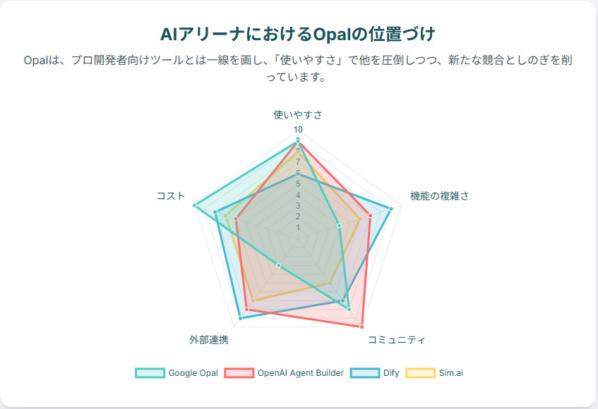 Opalを正しく評価するためには、競争の激しいAIツール市場において、それがどのような位置にあるのかを正確に理解することが不可欠です。Opalが登場した「Vibe Coding」や「AIエージェントビルダー」と呼ばれる領域は、今まさに戦国時代を迎えており、それぞれ異なる哲学を持つツールが次々と登場しています。ここでは、その中でも特に注目すべき競合ツールとの比較を通じて、Opalのユニークな立ち位置を明らかにします。