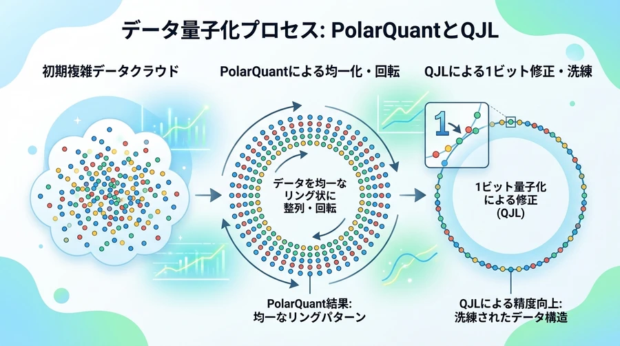 TurboQuantが「精度を落とさずに6倍も圧縮できる」秘密は、二段階の数学的な工夫にあります。それぞれ「PolarQuant(ポラークアント)」と「QJL(量子化されたジョンソン=リンデンシュトラウス変換)」と呼ばれています [12]。