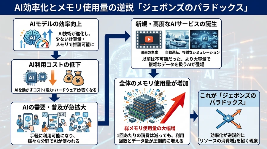 結果: 個々のAIが使うメモリは減っても、AI自体の利用数やモデルの巨大化が進むため、最終的にはより多くのメモリチップが必要になるという、プラスの循環が生まれると考えられています [34]。
