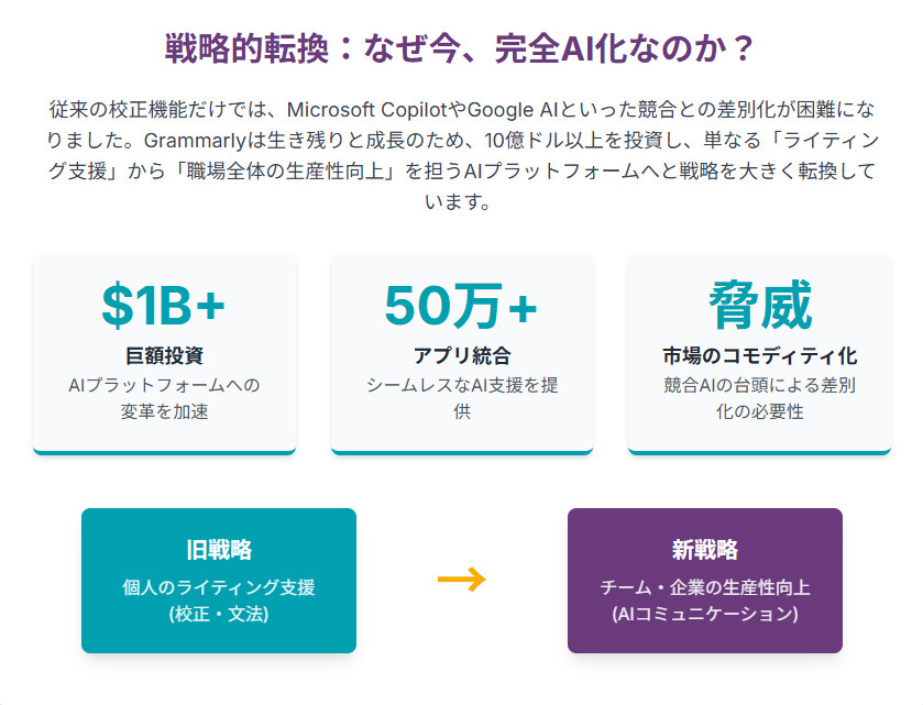 すでに毎日4,000万人以上が利用し、高い収益性を誇るGrammarlyがなぜこれほどの投資を必要としたのでしょうか。その背景には、MicrosoftのCopilotやGoogleのAI機能など、巨大テック企業が基本的な文章校正機能を自社製品に無料で統合し始めたことによる「コモディティ化」の脅威があります。つまり、従来の文法チェック機能だけでは、もはや競争優位性を保てなくなるという危機感です。