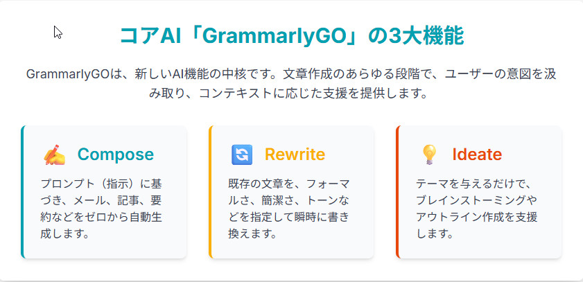 GrammarlyGOの主な機能は、以下の3つに大別されます。初心者でも直感的に使えるように設計されています。