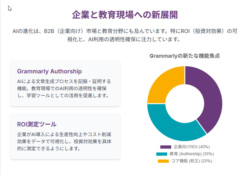 この戦略の一環として、教育現場のAI利用における透明性を確保する「Grammarly Authorship」や、ビジネスにおけるAI投資の効果を可視化する「ROI測定ツール」といった、特定の高価値な分野に特化した新機能が開発されています 11。これは、誰もが使える水平的なツールから、特定の業界のワークフローに深く組み込まれる垂直的なプラットフォームへと進化する試みであり、Grammarlyを代替不可能な存在にするための重要な一手と言えるでしょう。