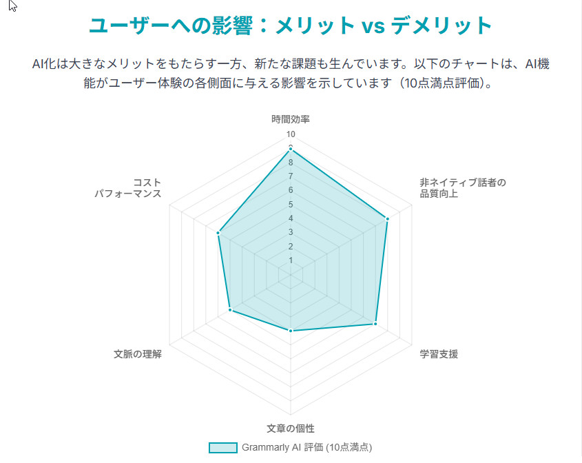 | 非ネイティブ話者の品質向上:自然で正確な英語表現を可能にし、自信を与える [17, 20]。 | 文脈を無視した過剰修正:創造的な表現や専門用語を誤って「間違い」として指摘することがある [13, 21]。 |