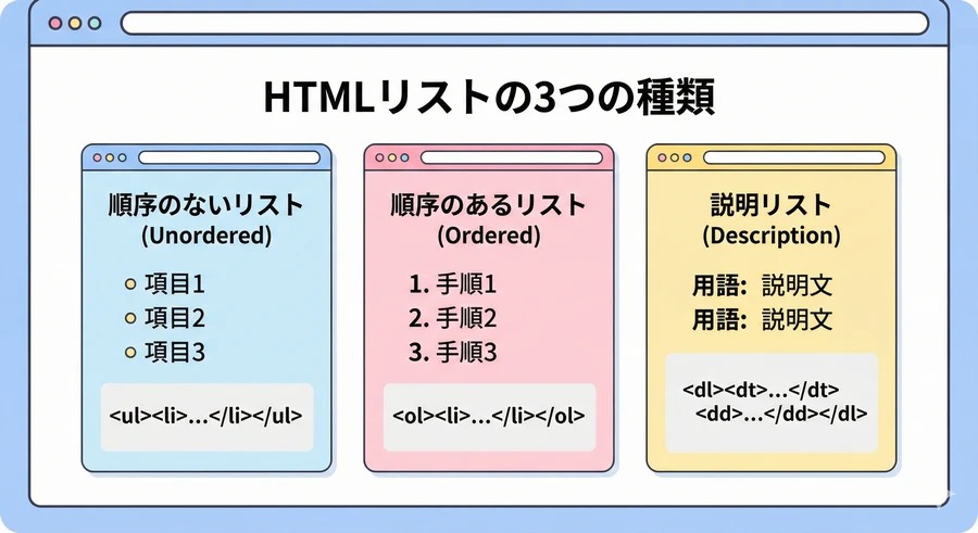 HTMLで箇条書きを表現する際には、その情報の「意味」に応じて適切なタグを選択することが求められます。主要なリスト形式には、順序のないリスト、順序のあるリスト、そして説明リストの3種類が存在します [3]