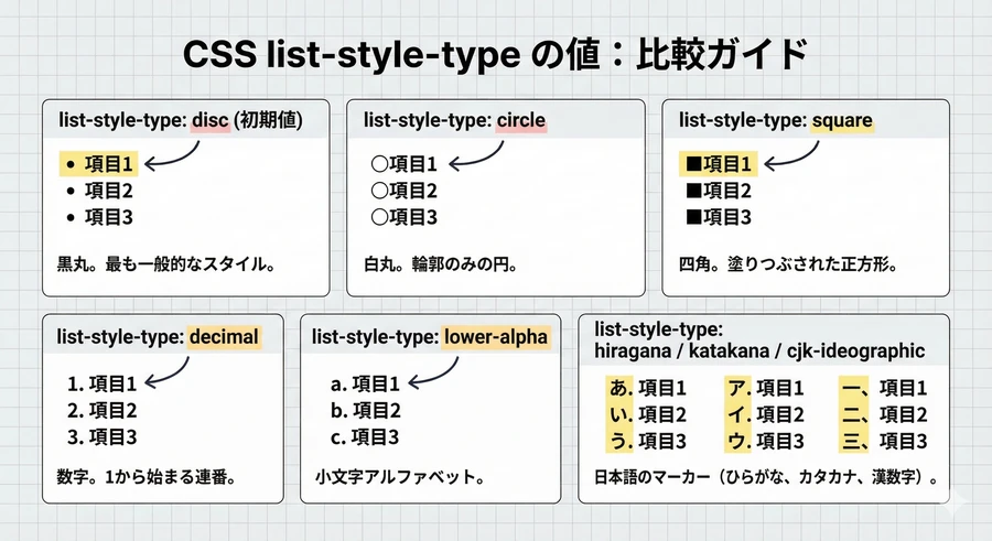 list-style-type: マーカーの種類を指定します。disc(黒丸)、circle(白丸)、square(四角)のほか、noneを指定することでマーカーを非表示にできます [15]
