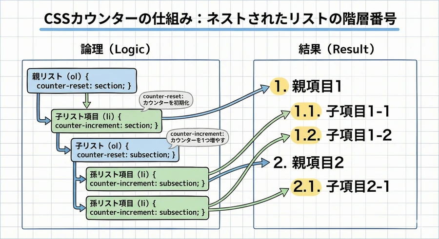 ウェブサイトの章立てや、ネストされた深い階層構造において、「1-1」「1-2-1」のような形式で自動的に番号を振りたい場合、CSSカウンタ(CSS Counters)機能が非常に強力です [20]