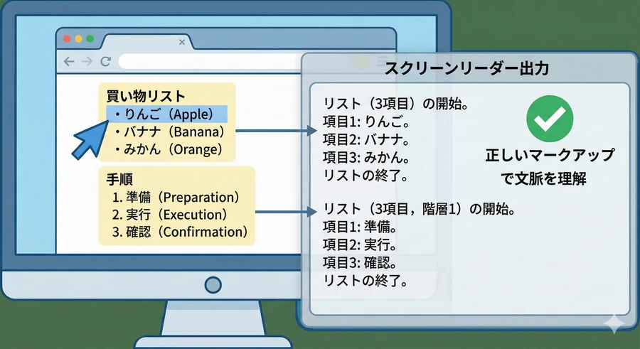 箇条書きの実装において、視覚的な美しさ以上に考慮すべきなのがアクセシビリティです。特にスクリーンリーダー(画面読み上げソフト)を使用するユーザーにとって、箇条書きが正しく「リスト」として認識されるかどうかは、情報の理解度に大きく関わります [26]