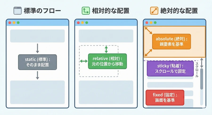 | static | 通常配置 | なし(通常のフロー) | デフォルト値。位置指定プロパティ(top等)が機能しない。 |