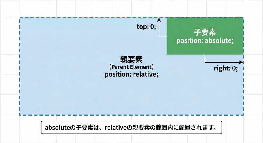 しかし、実務において relative が最も頻繁に利用される理由は、移動そのものではなく、次に解説する position: absolute; を持つ子要素の「基準点(包含ブロック)」としての役割にあります 。親要素に relative を設定することで、子要素の配置範囲をその親の領域内に限定できるようになります。この親子関係の構築こそが、CSSレイアウトの根幹を成すテクニックです。