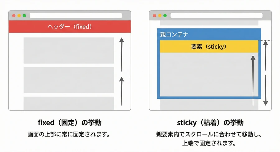 position: sticky; は、relative と fixed の長所を併せ持った比較的新しい配置形式です。要素は最初は通常のフローに従ってスクロールされますが、あらかじめ指定した位置(閾値)に到達すると、その場に留まる(固定される)挙動を見せます 。