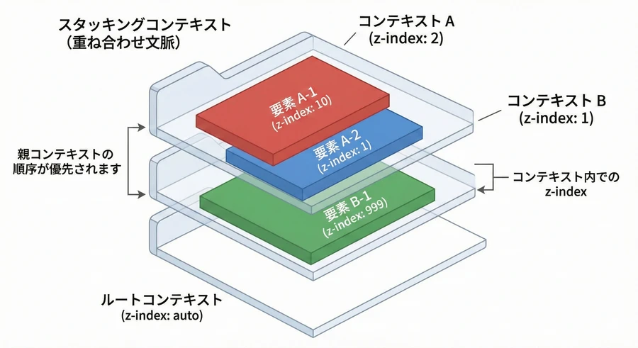 スタッキングコンテキストが入れ子になっている場合、親コンテキスト同士の重なり順が優先されます。例えば、親A(z-index: 1)の中に子B(z-index: 9999)があり、隣り合う親C(z-index: 2)がある場合、子Bは親Cよりも大きな z-index を持っていますが、親レベルでの勝負(1 vs 2)に負けているため、親Cの背後に隠れてしまいます 。