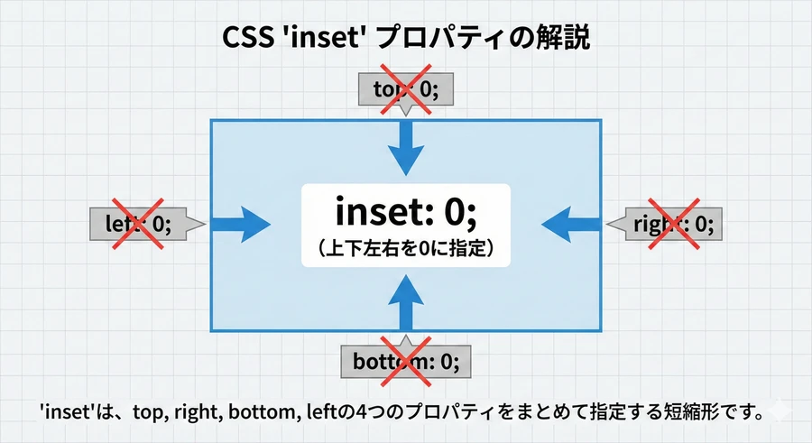 top, right, bottom, left を個別に記述するのは手間がかかるだけでなく、コードの可読性を低下させます。inset プロパティを使用すれば、これらを一行で表現できます 。
