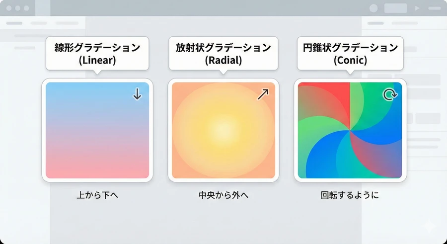 CSSグラデーションは、ブラウザによって生成される「画像」として扱われます。そのため、基本的にはbackground-colorではなく、background-image(または一括指定プロパティのbackground)に指定します。まずは、現在利用可能な主要な3つの種類と、その特徴を把握しましょう。