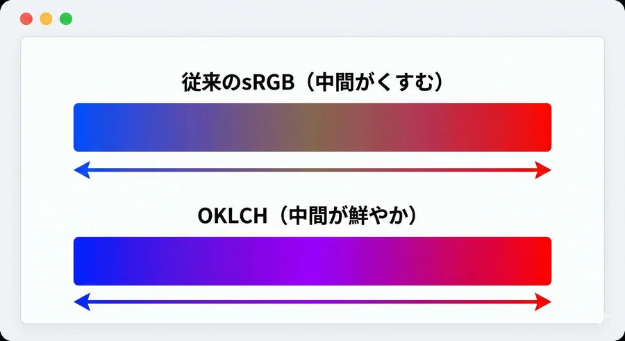 グラデーションにおいてこの特性は極めて強力です。例えば、青色から赤色へ変化する際、従来のRGB補間では中間地点で色がグレーがかって「くすんで」見える(デッドゾーン)ことがありましたが、OKLCH補間を指定すると、中間色も鮮やかで透明感のある遷移が可能になります [14]。