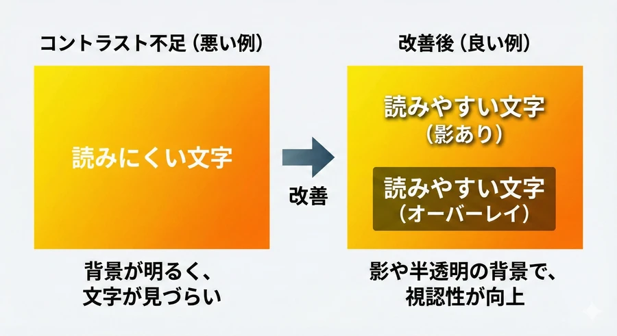 グラデーションを背景にする場合、その上に載せる文字の読みやすさに注意してください。グラデーションは場所によって色が異なるため、ある場所では読めても別の場所では背景と同化して読めなくなることがあります [29]。