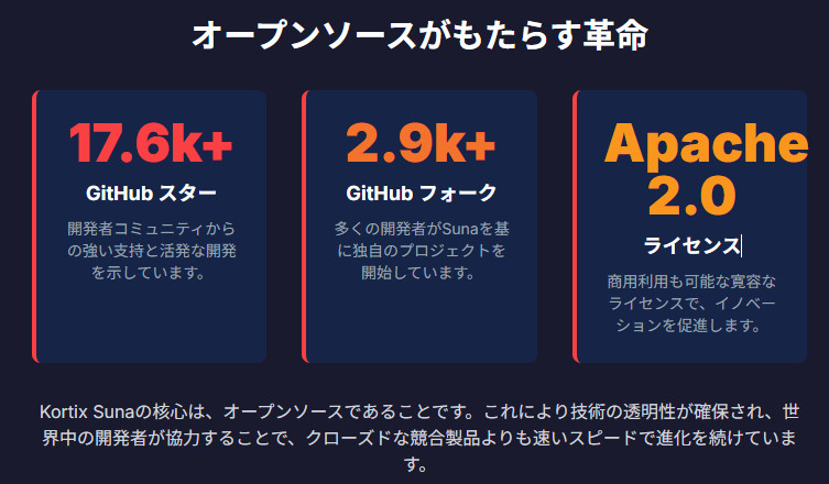 第三に、コミュニティによる協力と発展です。オープンソースであることにより、世界中の開発者がバグの修正、新機能の追加、ドキュメントの改善などに貢献できます 。実際に、SunaのGitHubリポジトリは17,600以上のスターと2,900以上のフォークを獲得しており、活発なコミュニティが形成されていることを示しています 。この集合知は、単一の企業が閉鎖的な環境で開発を進めるよりも、はるかに速いスピードでプラットフォームを進化させる原動力となります。